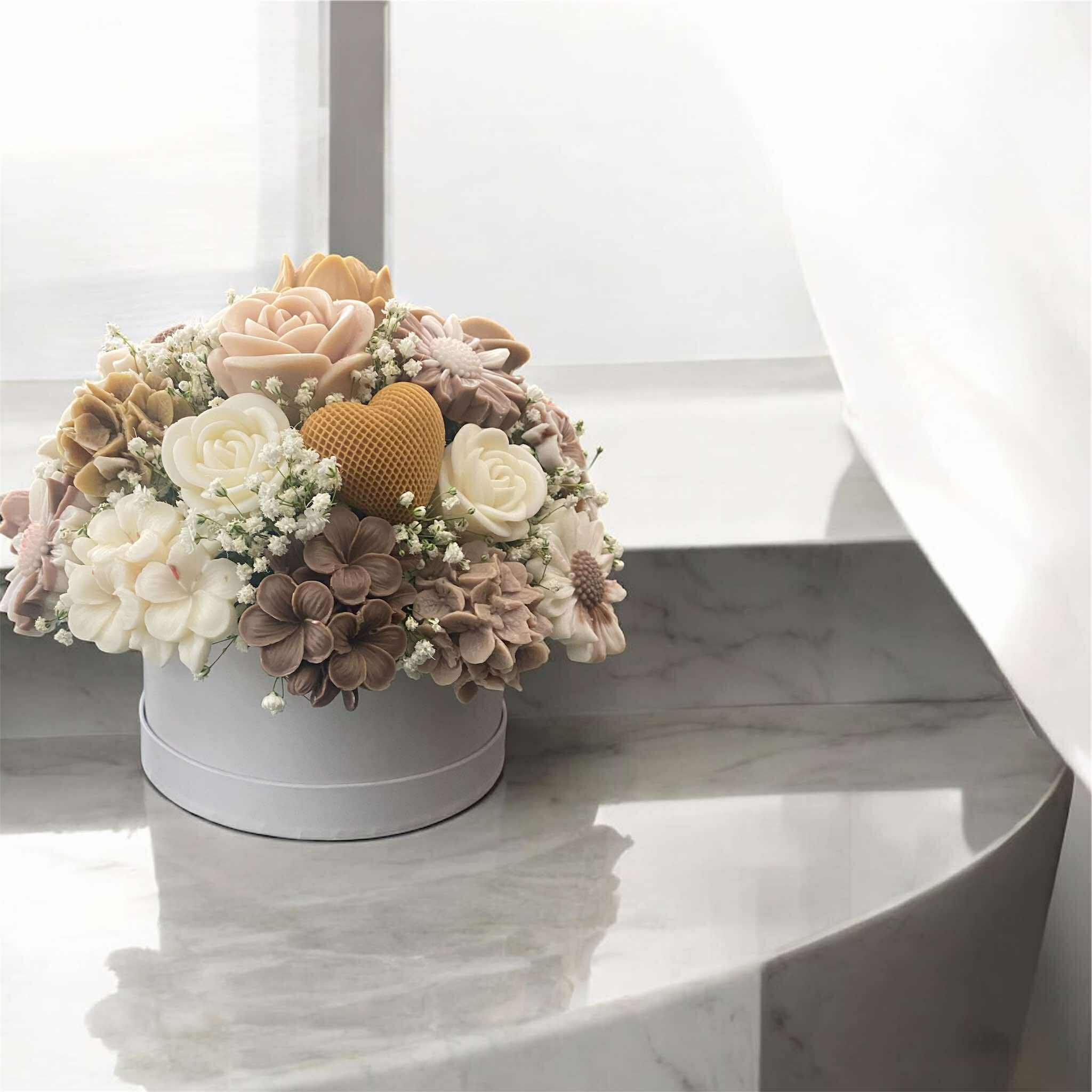 Χειροποίητη σύνθεση από άνθη κεριού σε φυσικούς, απαλούς τόνους, που αποπνέουν ζεστασιά και αρμονία.